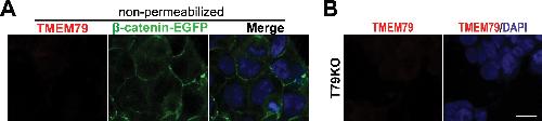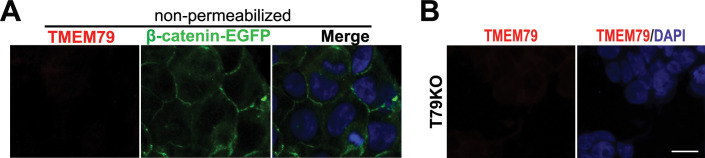 Figure 4—figure supplement 1. TMEM79 is an ER-resident protein.(A) TMEM79 is not detectable by the TMEM79 antibody without cell permeabilization. Note that the antibody (Key Resources Table) recognizes the TMEM79 C-terminus (Figure 1D), which is either in the ER lumen, or extracellular if TMEM79 were to be on the PM. This result is consistent with TMEM79 being an ER- but not PM-resident protein. (B) T79KO cells lack TMEM79 staining completely, demonstrating specificity of the TMEM79 antibody for immunostaining. Scale bar = 10 μm. |