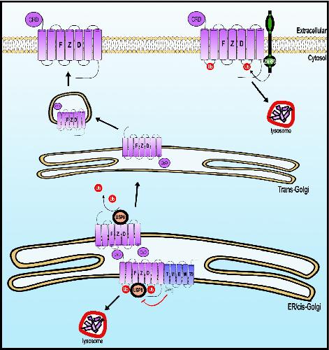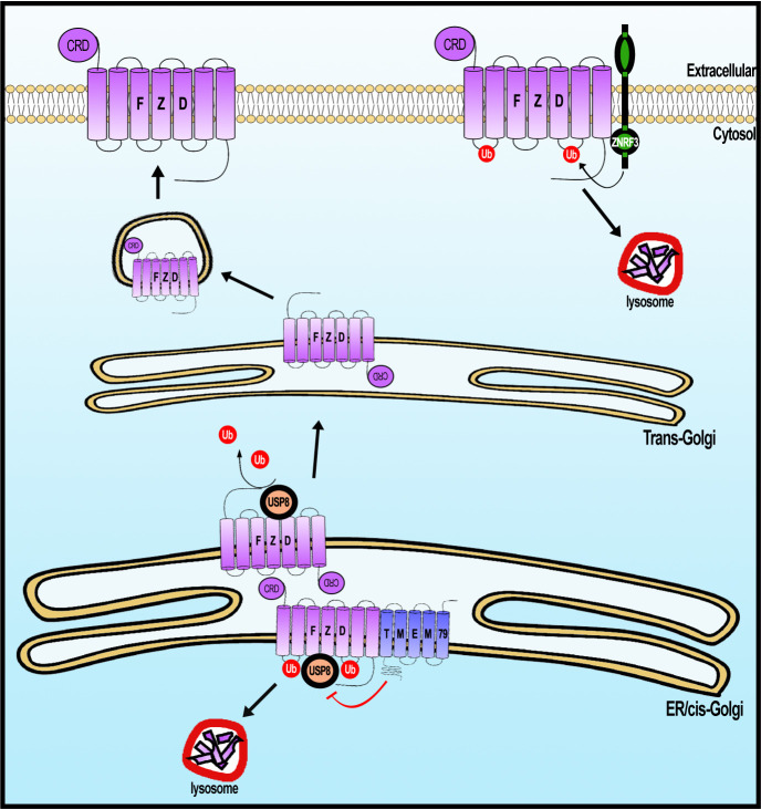 Figure 8. A working model of Frizzled (FZD) regulation by USP8 and TMEM79.FZD is synthesized in the ER and is ubiquininated (by an unknown E3 ligase, not depicted). FZD deubiquitination by USP8 permits FZD to traffic to Golgi and PM ultimately. ER-resident TMEM79 acts by complexing with FZD and USP8 and inhibiting USP8 deubiquitination of FZD, thereby ensuring ubiquitinated FZD in the ER to traffic to the lysosome for degradation. For FZD that escapes TMEM79-mediated degradation and matures to the PM, ZNRF3 promotes FZD ubiquitination at the PM, leading to endosomal-lysosomal degradation of FZD. These two complementary mechanisms ensure a rate-limiting amount of FZD at the PM. |