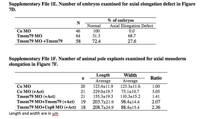 Supplementary file 1. Table 1E. Number of embryos examined for axial elongation defect in Figure 7D. Table 1F. Number of animal pole explants examined for axial mesoderm elongation in Figure 7F. |