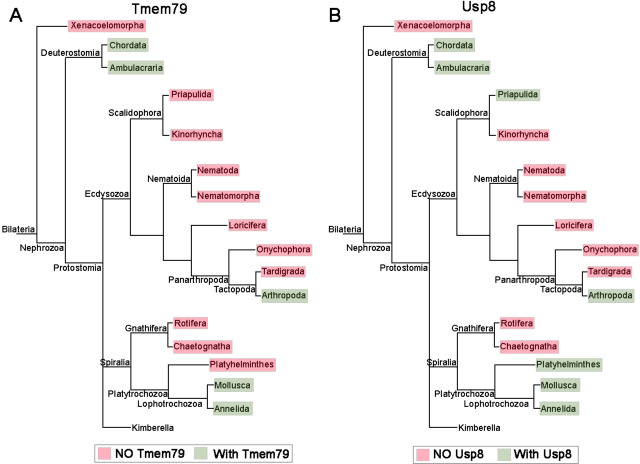 Figure 9. The phylogenetic preservation or loss in bilateria of Tmem79 (A) and Usp8 (B). Tmem79 and Usp8 are present throughout deuterostomes while exhibit frequent and similar losses in protostomes. Note that both genes are found in cnidaria and thus was likely present in the common cnidarian and bilaterian ancestor (Figure 1âfigure supplement 1). Preservation of Tmem79 in protostomes is always accompanied by preservation of Usp8, but not vice versa. One such example is in arthropods: Tmem79 is absent but Usp8 is present in Drosophila while the Acari has Tmem79 and Usp8. Neither gene is found and was probably lost in Xenacoelomorpha. |