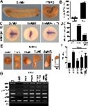 Figure 6âfigure supplement 1 Xenopus tmem79 is required for anterior neural patterning and neural crest formation without affecting the head organizer. (A) A Tmem79 sense probe as a negative control does not show any hybridization signal in embryos at different stages. (B) Dorsal injection of Tmem79 mRNA induces an enlarged head in >50% embryos and spina bifida in another about 30% embryos. Anterior to right. Also see Supplementary file 1G. (C) Tmem79MO inhibits protein synthesis from the Xenopus Tmem79 (xTmem79) mRNA, but not of the mouse Tmem79 (mT79) mRNA, which is used in rescue experiments. GAPDH is a protein loading control. (D) Usp8MO inhibits protein synthesis from the Xenopus Usp8 (xUsp8) mRNA, but not from a mutant Usp8 (x-mutUsp8) mRNA, in which several nucleotides in xUsp8 5â-UTR targeted by the MO have been altered. (E) Dorsal-animal injection of Tmem79 MO reduces expression of anterior and mid/hind brain markers Bf1, Krox20, and En2, an anterior (cement gland) marker Xag (each seen in the anterior view), and a neuronal marker n-tubulin (see in the dorsal view), examined at stage 16. Co-injection of mTmem79 with Tmem79MO rescues expression of these markers. Also see Supplementary file 1H. (F) Dorsal-animal injection of β-cateninMO or Usp8MO leads to enlarged head formation at the tailbud stage (anterior to right), supporting Usp8 acting positively in Wnt/β-catenin signaling in vivo. Also see Supplementary file 1I. (G) Dorsal-animal injection of Tmem79MO affects neither expression of head organizer genes (Goosecoid, Chordin, Dkk1, and Lim1) nor that of dorsal genes (xnr3 and xnot) at stages 10.5â11. Vegetal views with dorsal to top. Also see Supplementary file 1J. (H) Dorsal-animal injection of Tmem79MO reduces expression of neural crest markers FoxD3 and snail1 examined at stage 16. Also see Supplementary file 1K. |