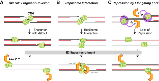 Figure 1. Possible models of CRL2Lrr1 recruitment upon DNA replication termination. (A) Okazaki fragment collision model. Upon CMG encounter with the Okazaki fragment of the opposing fork, CMG undergoes a conformational change that triggers CRL2Lrr1 recruitment. (B) Replisome interaction model. When two replication forks meet, the two CMG helicases interact, creating a structure that recruits CRL2Lrr1. In this model, CMGs reel in the template strands to complete DNA synthesis (gray arrows). In an alternative version of this model (not depicted), CMGs pass each other and interact with other protein components of the converging fork (e.g., PCNA), leading to CRL2Lrr1 recruitment. (C) Repression model. A protein or DNA structure (pink circle) suppresses binding of CRL2Lrr1 to CMG at the elongating replication fork. When forks converge, the repressive protein or DNA structure is lost, leading to CRL2Lrr1 recruitment.