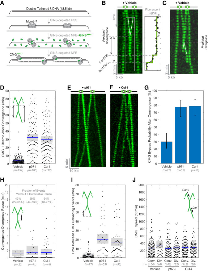 Figure 2. CMG complexes pass one another when unloading is prevented. (A) Scheme of the single-molecule imaging experiment. Green ovals represent GINSAF647. (B) CMGs converge and are rapidly unloaded. λ DNA was replicated in the presence of DMSO (vehicle) and imaged every 30 sec. Images of individual molecules were stacked to create kymograms. CMGs were false-colored in green. The signal in the region of interest (gray box) was integrated and is shown in the box at the right. The moment of CMG unloading was determined by the stepwise drop in signal intensity. Scale bars are shown at the bottom left. (C) Same as B but depicting an example in which CMGs are unloaded after divergence. (D) CMG lifetime after replisome convergence in the indicated conditions from C, E, and F. A schematic of the event being quantified is shown in green. (E) Same as B, but NPE contained p97-i. Note that rightward-moving CMG is brighter than the leftward-moving molecule, clearly showing the two helicases passing each other after convergence (as opposed to backtracking). (F) Same as B, but NPE contained Cul-i. (G) Percentage of total termination events where CMGs diverged after convergence. (H) Time interval between the moment of convergence and divergence. (I) Time interval between the unloading of the first and the second CMG molecule. (J) CMG speed during convergence (Conv.) or divergence (Div.) for termination events where the CMGs diverged. In D and H–J, the blue bar represents the mean, and the gray box indicates the 95% confidence interval estimated by bootstrapping. Values are reported in Supplemental Table S1.