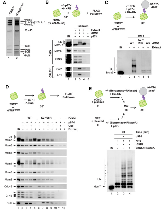 Figure 4. Recombinant CMG undergoes Mcm7 ubiquitylation in extract in the absence of DNA. (A) rCMG and rCMGK27/28R visualized with SYPRO Ruby stain. (B) rCMG from A was incubated in NPE or buffer in the presence or absence of p97-i, and then recovered using anti-FLAG resin and blotted for the indicated proteins. (C) rCMG and rCMGK27/28R from A were incubated in buffer or NPE in the presence of p97-i and His-tagged ubiquitin (His-Ub). Ubiquitylated proteins were isolated with Ni-NTA resin and immunoblotted for Mcm7. (D) rCMG and rCMGK27/28R from A were incubated in buffer or NPE in the presence or absence of p97-i or Cul-i, CMG and associated proteins were isolated on anti-FLAG resin, and the samples were immunoblotted with the indicated antibodies. (Gray arrowheads) Degradation products of Mcm4. (E) rCMG supplemented with His-Ub was treated with 2 U/µL benzonase and 2.5 µg/µL RNase A for 20 min. Simultaneously, NPE supplemented with p97-i was treated with benzonase and RNase A for 20 min. Both NPE and rCMG samples were supplemented with a 5.4-kb plasmid to verify the efficiency of benzonase treatment. The two treated samples were mixed together and incubated for a further 40 min. At that point, His-ubiquitin pull-down was performed, followed by immunoblotting with Mcm7 antibodies. Samples were also removed at the 20- and 60-min time points for DNA analysis (Supplemental Fig. S5A).