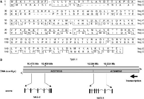 Figure 1. hAG-2 and hAG-3 show close homology at the protein level and are adjacent to each other at chromosome position 7p21. (A) Protein sequence alignment of hAG-2 and hAG-3 (DNAStar MegAlign program–Jotun Hein alignment). The boxed regions on the hAG-3 sequence indicate exact amino-acid matches of hAG-3 with hAG-2. (B) Diagram illustrating the genomic locations, transcriptional orientation, and exon structures of hAG-2 and hAG-3 on chromosome 7p21.