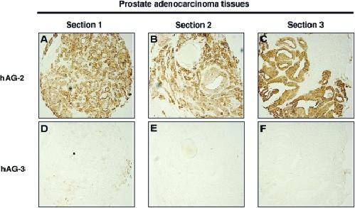 Figure 3. hAG-2, but not hAG-3, protein is expressed in malignant prostate epithelial cells. Immunohistochemical analysis of hAG-2 and hAG-3 in three prostate adenocarcinoma donor tissue sections.