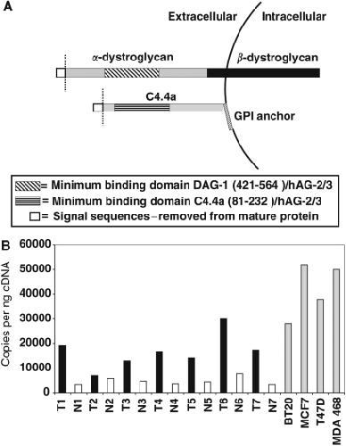 Figure 4. (A) Diagrammatic illustration of DAG-1 and C4.4a proteins showing the extracellular hAG-2 and hAG-3 minimum binding domains identified by yeast two-hybrid analyses. Although both structures are shown attached to the same cell, it is likely that the interactions of the hAG proteins are autocrine in nature for C4.4a and paracrine for DAG-1. (B) Real-time quantitative RT–PCR analysis of C4.4a mRNA expression in seven donor-matched adjacent normal (N) and tumour (T) breast samples (indicated 1–7) and four human breast cancer-derived cell lines. C4.4a is upregulated in all of the tumour samples, relative to their matched normal tissue, and expressed in all the breast cancer cell lines used to create the yeast two-hybrid prey library. Expression values are described as copies per nanogram of cDNA derived from a standard curve of known dilutions of C4.4a DNA.