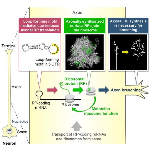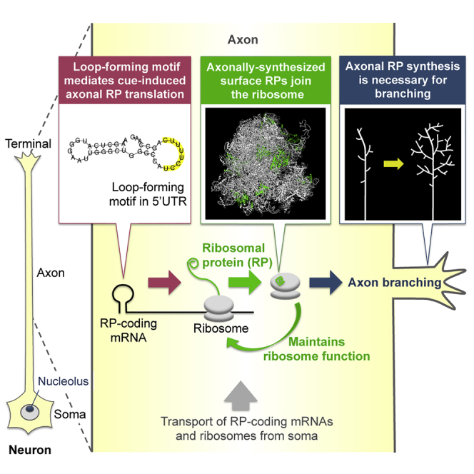 Ribosome assembly occurs mainly in the nucleolus, yet recent studies have revealed robust enrichment and translation of mRNAs encoding many ribosomal proteins (RPs) in axons, far away from neuronal cell bodies. Here, we report a physical and functional interaction between locally synthesized RPs and ribosomes in the axon. We show that axonal RP translation is regulated through a sequence motif, CUIC, that forms an RNA-loop structure in the region immediately upstream of the initiation codon. Using imaging and subcellular proteomics techniques, we show that RPs synthesized in axons join axonal ribosomes in a nucleolus-independent fashion. Inhibition of axonal CUIC-regulated RP translation decreases local translation activity and reduces axon branching in the developing brain, revealing the physiological relevance of axonal RP synthesis in vivo. These results suggest that axonal translation supplies cytoplasmic RPs to maintain/modify local ribosomal function far from the nucleolus in neurons.