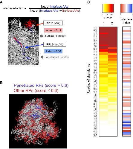 Figure 3. Structural Positions of RPs Encoded by Axonally Localized mRNAs Are Surface Biased(A) Formula of interface-index (upper) and a partial structure of the ribosome, generated with PyMOL, showing the relation between RP position and interface-indices.(B) Human 80S ribosome structure, generated with PyMOL, showing the position of all RPs that are classified based on the interface-index.(C) Ranking of abundance (average FPKM) of RPs coding mRNAs (n = 2) and interface-index scores of RPs (more blue = higher, more red = lower). |