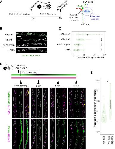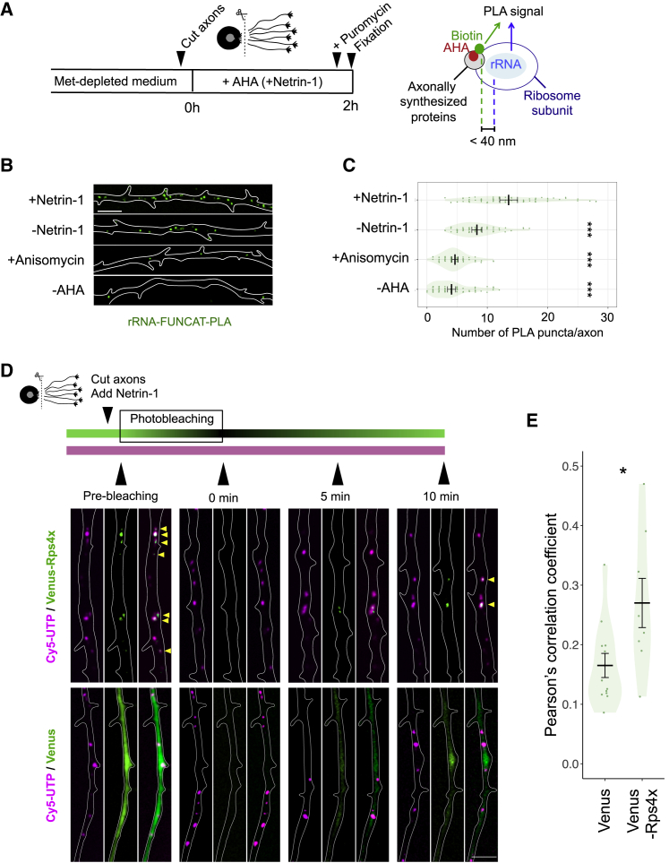 Figure 4. Axonally Synthesized RPs Co-localize with Ribosome-Containing Granules(A) Experimental workflow and a diagram describing the positional relation of each protein/probe in the rRNA-FUNCAT-PLA experiments.(B and C) Representative images (B) and plots for the number of PLA puncta in each condition (C) detected in the axon (bars, average with 95% CI, Mann-Whitney U test, âââp ⤠0.001). Scale bar, 5 μm.(D) Experimental workflow of the Venus + Cy5-UTP FRAP experiments (upper). Live imaging of Cy5-UTP (magenta) and UTR-Rps4x-Venus fusion or UTR-Venus (green) reporter before and 0, 5, and 10 min after photobleaching of the Venus (green) fluorescence. The yellow arrowheads indicate the sites of co-localization, and the white lines indicate the outlines of axons. Scale bar, 2 μm.(E) Plot showing Pearsonâs correlation coefficient of pixel intensities between Cy5-UTP signals and recovered Venus signals (Venus-Rps4x [n = 8] or Venus-only [n = 12]). Bars, average with SEM, Mann-Whitney U test, âp ⤠0.05. |