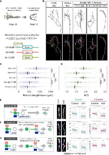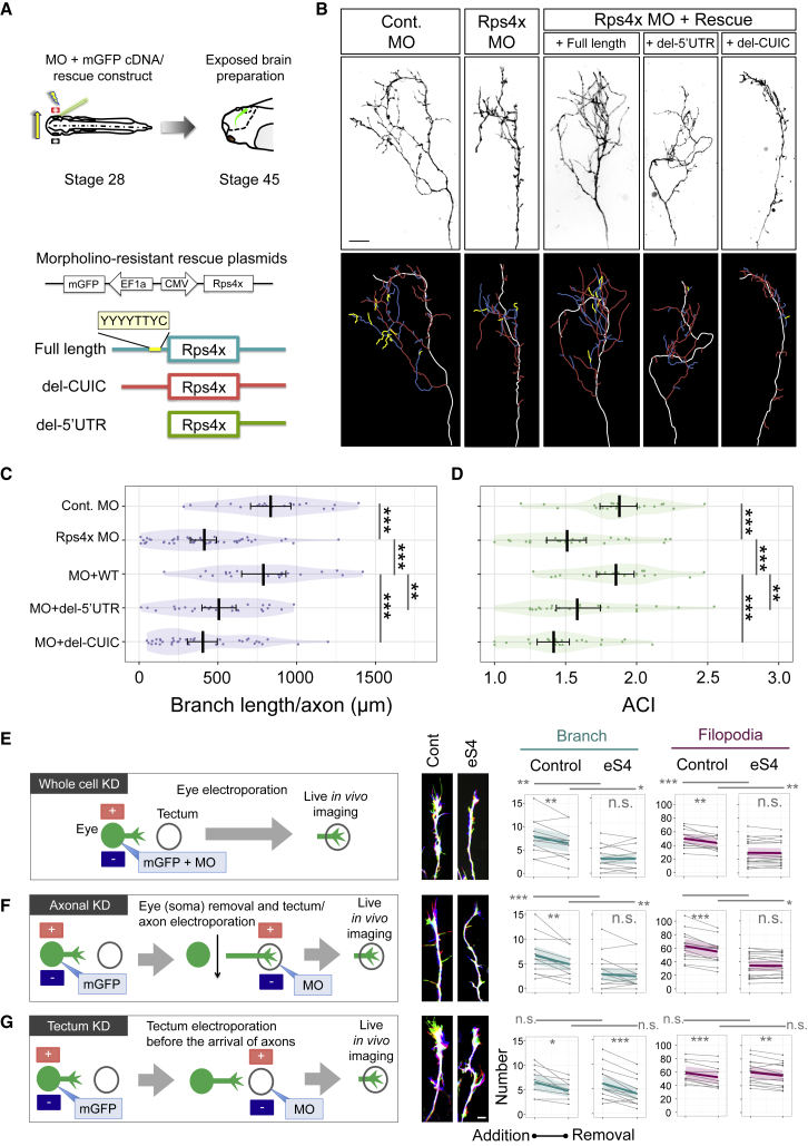 Figure 7. Axonal Translation of Rps4x/eS4 Is Crucial for Axon Branching In Vivo(A) Experimental workflow (upper) for eye electroporation and live image acquisition of axon branches/arbors. Dual promoter constructs (lower) used for rescue conditions.(B) Lateral view of a single in vivo RGC axon in the tectum with color-coded images of axon shaft (white), primary (red), secondary (blue), and tertiary (yellow) branches.(C and D) Average, 95% CI, and distribution of total branch length per axon (C) and axon complexity index (ACI; see Figure S7B for formula) (D) in the embryos electroporated with the morpholino/rescue constructs (1-way ANOVA with 2-stage step-up method of Benjamini, Krieger, and Yekutiei multiple comparisons test); n = 21 (Cont. MO), 47 (MO), 21 (MO + WT), 25 (MO + del-5â² UTR), and 37 (MO + del-CUIC).(EâG) Experimental workflow for each knockdown (KD) experiment (left) and quantification (right) of in vivo axon branching in control MOâ and rps4x MO+ axons after eye electroporation (whole-cell KD) (n = 12, Cont.; 20, Rps4x) (E) and tectum electroporation at stages 41â43 (axonal KD) (middle, n = 14, Cont.; 19, Rps4x) (F), and at stages 35â38 (tectum KD) (lower, n = 10, Cont.; 15, Rps4x) (G). Images (middle panel) show a merged overlay of 3 time points (0, 5, and 10 min in blue, red, and green, respectively). Line graphs (right) show the number of added/removed branches/filopodia (paired and unpaired t test, ââp < 0.01, âââp < 0.001; n.s., not significant). |