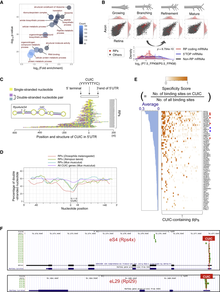 Figure 1. RP-Coding mRNAs Harbor a Common Loop Structure-Forming Sequence Motif in the 5ⲠUTR(A) Enrichment of GO terms in the Xenopus laevis RGC axon transcriptome.(B) Relative abundance (FPKM) of translated mRNAs coding for RPs (red) and other proteins (gray) in the mouse RGC axon (y axis) and retina (x axis), obtained by the Axon-TRAP system in vivo. The histogram (lower) shows the distribution of the ratio of abundance of 2 consecutive stages (refinement [P7.5]/branching [P0.5]). p value: Kolmogorov-Smirnov test between RP coding mRNAs and non-RP mRNAs.(C) Relative position of the CUIC and RNA-secondary structure of 5ⲠUTRs of mouse RP-coding mRNAs. Each bar represents 5ⲠUTR sequences and is colored by the predicted secondary structure. The position of CUIC is aligned at center (0 nt) and the x axis indicates the distance from the CUIC motif.(D) Average fraction of double-stranded nucleotides around the CUIC motif in 5ⲠUTRs of all CUIC-containing mouse genes and RPs (moving average, 7-nt window).(E) The ranking of RBPs that specifically bind to the CUIC motif of RP-coding mRNAs. The heatmap color indicates the specificity score calculated by the formula in the upper panel. The histogram (left) shows the average of the specificity score of each RBP for all CUIC-containing RP mRNAs. Red dots mark eIF3 components, and blue dots mark TIA1 and TIAL1.(F) UCSC Genome browser view of CLIP clusters of eIF3 components on 2 RP-coding mRNAs. |