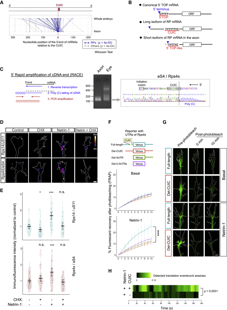 Figure 2. CUIC Motif Is Involved with Alternative 5â² End and Netrin-1-Stimulated Translation of Axonal RP mRNAs(A) Plot showing the difference of the position of 5â² terminal of CUIC-containing mRNAs between the axon and the whole embryo. The x axis indicates the relative position of 5â² terminal compared to CUIC.(B) Diagram showing 2 isoforms of the CUIC-containing mRNA with alternative 5â² ends and the 5â² TOP mRNA.(C) Diagram (left), gel image (middle), and Sanger sequencing result (right) of 5â² RACE products of Rps4x/eS4 mRNAs in axon and eye samples.(D and E) Representative images (D) and quantification of quantitative immunofluorescence (QIF) (E) for Rps14/uS11 (n = 42, control; 59, CHX; 66, Netrin-1; 64, Netrin-1 + CHX) and Rps4x/eS4 (n = 59, control; 50, CHX; 70, Netrin-1; 44, Netrin-1 + CHX) in RGC growth cones with or without Netrin-1 (5 min)/cycloheximide (CHX) treatment (bars, average with 95% confidence interval [CI], Mann-Whitney U test compared to the control, âââp ⤠0.001, âp ⤠0.05). Scale bar, 5 μm.(F and G) Plots (F) and representative images (G) of relative fluorescence recovery of Venus reporter constructs after photobleaching (error bar, SEM) in RGC growth cones. âââp < 0.0001; 2-way ANOVA comparing full-length UTRs (n = 8) with Del-motif (n = 12). Scale bar, 2 μm.(H) Moving average (20 s window) of the count of detected translation events per unit area per second with the Netrin-1 stimulation in single-molecule translation imaging. p value: Mann-Whitney U test between full-length UTRs (n = 11) and Del-motif (n = 12) using the total count in each growth cone. |