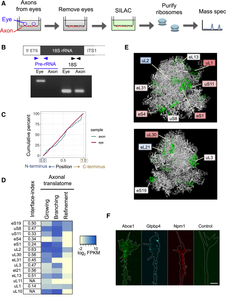 Figure 5. Axonally Synthesized RPs Physically Interact with the Ribosome in a Nucleolus-Independent Manner(A) Experimental strategy of axon purification, SILAC labeling, and axonal ribosome purification.(B) Diagram and gel image of RT-PCR detection of mature 18S rRNA and pre-rRNA.(C) Cumulative percentage of the relative position of labeled peptides detected in axonal (cyan) and eye (red) ribosome samples.(D) List of RPs whose labeled peptides were detected in the axonal ribosomes. The heatmap shows the translation levels of RPs in 3 different developmental stages of in vivo mouse RGC axons.(E) Human 80S ribosome structure with indication of the RPs whose labeled peptides were detected in the axonal ribosomes. The colors of the squares represent the interface-index of each labeled RP (see Figure 3).(F) Immunostaining of ribosomal assembly factors and a secondary antibody-only control in cultured Xenopus laevis RGC axons. Scale bar, 5 μm. |