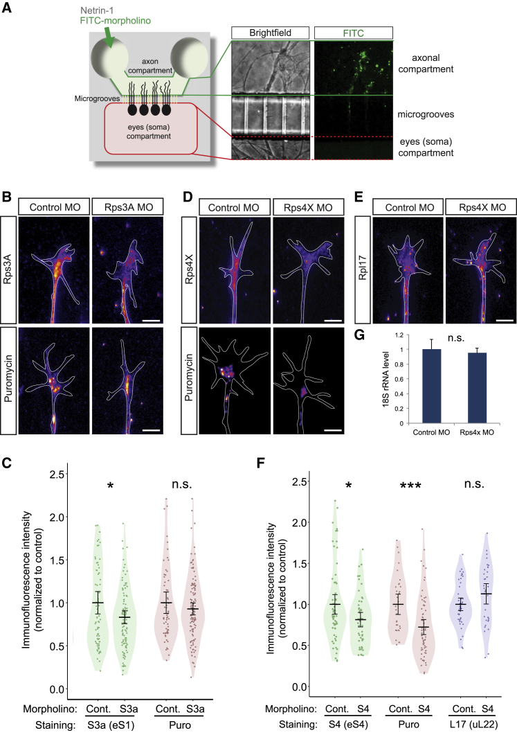 Figure 6. Locally Synthesized Rps4x/eS4 Is Required to Maintain Ribosome Function in Axons(A) Diagram (left) and image of RGC axons after FITC-morpholino introduction in a microfluidic chamber.(BâF) Images (B, D, and E) and QIF plots (bars, average, 95% CI, and distribution of normalized levels) (C and F) of Rps3a/eS1, Rps4x/eS4, Rpl17/uL22, and puromycin immunostaining in axons treated with control morpholinos (Cont.) or with morpholinos against rps3a (eS1) (B and C) or against rps4x (eS4) (DâF), with Welch t test (âp = 0.030, C; 0.015, F; âââp = 0.0004; n.s., not significant).(G) qRT-PCR quantification, normalized to control MO, of 18S rRNA in axonal samples treated with control or rps4x (eS4) morpholinos (n.s., not significant in Mann-Whitney U test). |