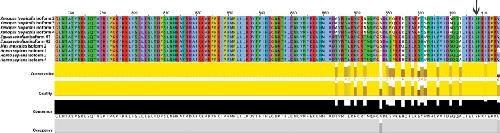 Fig 3. Alignment of protein sequences between Xenopus tropicalis, Equus caballus, Mus musculus and Homo sapiens.RAPGEF5 protein sequences from the two predicted equine NCBI proteins (isoform X1 = XP_023495120.1 and isoform X2 = XP_023495121.1), three human RefSeq proteins that extended to the 3’ end of the equine annotated protein (NP_036426.4 = isoform 1, NP_001354529 = isoform 2 and NP_001354531.1 = isoform 4), the only mouse RefSeq protein (NP_787126.3 = isoform 2) and four predicted Xenopus tropicalis (isoform 2 = XP_031759510.1, isoform 1 = XP_031759509.1, isoform 3 = XP_017950421.2 and isoform 4 = XP_031759511.1) proteins were aligned, demonstrating strong conservation even within alternate isoforms of RAPGEF5. The serine residue that is altered with RAPGEF5 c.2624C>A,p.Ser875* is highlighted with a black arrow toward the end of the sequence alignment.