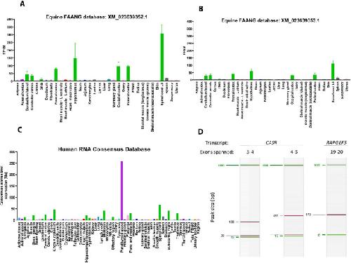 Fig 4. RAPGEF5 transcript expression across tissues in horse (A, B) and human (C).In 45 equine tissues with publicly available RNA-sequencing data from the FAANG initiative, the two NCBI annotated equine transcripts of RAPGEF5 (A) XM_023639352.1 and (B) XM_023639353.1 were most highly expressed in brain and spinal cord (green; median and 95% confidence interval graphed for n = 2 horses). Parathyroidtissue was not included in this biobank. (C) In humans, RAPGEF5 transcript expression was enriched in the nervous system (green) and endocrine tissues (purple). Parathyroid gland had the highest RNA expression of RAPGEF5. FPKM = fragments per kilobase of transcript per million mapped reads, Nx = consensus normalized expression. (D) RAPGEF5 is expressed in parathyroidtissue from a healthy control foal (primer sets spanning exons 19â20; expected product size 178 bp). Two primer sets, spanning exons 3â4 and 4â5 from CASR, were used as an internal control to confirm parathyroidtissue.