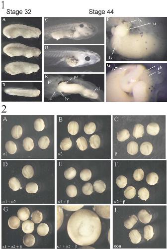 Fig. 3. Late effects of anti-Xsox17b and a1 morpholinos. Panel 1. Anti-Xsox17b morpholino (10 ng). (A) A range of phenotypes at stage 35 produced by a total