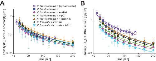 FIGURE 5:. Dynamics of the ratio of DNA content to nuclear size parameters during nuclear expansion. (A) Dynamics of density DV of DNA content per estimated nuclear volume in samples with different DNA content in X. laevis cytoplasmic extract. (B) Dynamics of density DSA of DNA content per estimated nuclear surface area in the samples with different DNA content in X. laevis cytoplasmic extract. Average values from each extract preparation are plotted. Each data set is fitted to the power regression line. Error bars, SD. |