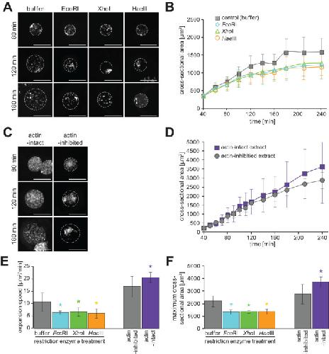FIGURE 6:. Nuclear expansion dynamics after modification of chromatin interaction with the nuclear envelope. (A) Representative images of reconstructed nuclei from X. laevis sperm chromatin in the presence of restriction enzymes (EcoRI, XhoI, or HaeIII) with the appropriate buffer after incubation for the indicated time. (B) Dynamics of the measured mean cross-sectional area of reconstructed nuclei in the presence of the indicated restriction enzymes, indicated by different colors. (C) Representative images of reconstructed nuclei from X. laevis sperm chromatin in the actin-intact extract after the indicated incubation time. DNA was stained with Hoechst 33342. Broken circles represent the position of the nuclear membrane. Bars, 50 µm. (D) Dynamics of the measured mean cross-sectional area of reconstructed nuclei in the actin-intact extracts (purple) or conventional actin-inhibited extracts (gray). Average values from each extract preparation are connected by a line in each data set. (E) Calculated expansion speeds and (F) measured maximum values of nuclear cross-sectional area of samples treated with buffer control (gray, n = 6), EcoRI (light blue, n = 6), XhoI (green, n = 5), HaeIII (orange, n = 5) and using actin-inhibited extract (gray, n = 37) or actin-inhibited extract (purple, n = 6). Average values from each extract preparation are shown. Error bars, SD. Asterisk, P value from Wilcoxon test compared with that in each control condition. *, statistically significant difference, P < 0.05. |