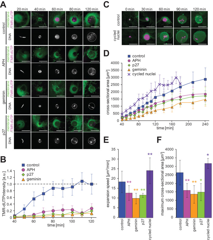 FIGURE 1:. Nuclear expansion dynamics after manipulation of DNA replication. (A) DNA, membrane, and incorporated TMR-dUTPs were visualized in the reconstructed nuclei in the presence of DNA replication inhibitors (APH, geminin, and p27) after the indicated incubation time. Merged images (top) of membrane (green) with TMR-dUTPs (magenta) and DNA (bottom) are shown. Broken circles represent the position of the nuclear membrane. Bars, 50 µm. (B) Dynamics of the intensities of the incorporated TMR-dUTPs in whole nuclei. The intensity was calculated by multiplying the measured mean TMR-dUTP intensity (/µm2) by the measured nuclear cross-sectional area. Each calculated value was divided by the mean value of the individual extract preparation after 120 min of incubation with X. laevis sperm chromatin. Control: n = 11; APH: n = 8; geminin: n = 3; p27: n = 4. (C) DNA (magenta) and membrane (green) were visualized in the nuclei from replicated chromatin in the second interphase of the cycling extract (cycled nuclei) and from sperm chromatin in the first interphase (control) after the indicated incubation time. Bars, 50 µm. (D) Dynamics of the measured mean cross-sectional area in the nuclei with X. laevis sperm chromatin in the presence of each DNA replication inhibitor (control: n = 34; APH: n = 20; geminin: n = 5; p27: n = 3) or with replicated chromatin in the cycling extract (cycled nuclei: n = 8). Average values are connected by a line in each data set. (E) Calculated expansion speeds and (F) measured maximum values of the nuclear cross-sectional area during incubation. Averages of values from each extract preparation are plotted. Error bars, SD. Asterisks, P value from Wilcoxon test compared with samples in the control. * and **, statistically significant difference, P < 0.05 and P < 0.001, respectively. |