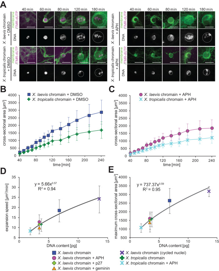 FIGURE 2:. Nuclear expansion dynamics using different sperm chromatins. (A) DNA, membrane, and incorporated TMR-dUTPs were visualized in the reconstructed nuclei from X. laevis or X. tropicalis sperm chromatin in the presence of DMSO (buffer control) or APH after the indicated incubation time. Merged images (top) of membrane (green) and TMR-dUTP (magenta) and DNA (bottom) are shown. Broken circles represent the position of the nuclear membrane. Bars, 50 µm. (B) Dynamics of the measured mean cross-sectional area in the nuclei from X. laevis (blue, n = 34) or X. tropicalis (green, n = 12) sperm chromatin. (C) Dynamics of the measured mean cross-sectional area in the nuclei from X. laevis (pink, n = 20) or X. tropicalis (light blue, n = 12) sperm chromatin in the presence of APH. Average values are connected by a line in each data set. Error bars, SD. (D) Calculated expansion speeds and (E) measured maximum values of the nuclear cross-sectional area during incubation were plotted against the DNA content within the nucleus. Averages of values in each DNA content are fitted to the power law regression. Error bars, SD. |