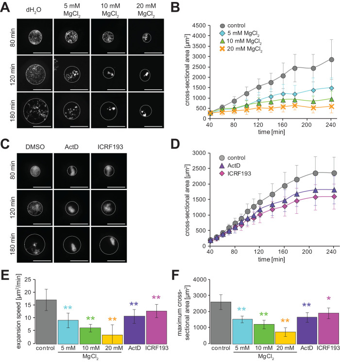 FIGURE 7:. Nuclear expansion dynamics after manipulation of chromatin condensation. (A) Representative images of the reconstructed nuclei from X. laevis sperm chromatin in the presence of MgCl2 at the indicated concentrations or dH2O for buffer control after the indicated incubation time. (B) Dynamics of the measured mean cross-sectional area of reconstructed nuclei in the presence of extra Mg2+ ions. Control: n = 4; 5 mM: n = 4; 10 mM: n = 4; 20 mM MgCl2: n = 4. (C) Representative images of the reconstructed nuclei of X. laevis sperm chromatin in the presence of actinomycin D (ActD), ICRF-193, or DMSO for buffer control after the indicated incubation time. DNA was stained with Hoechst 33342. Broken circles represent the position of the nuclear membrane. Bars, 50 µm. (D) Dynamics of the measured mean nuclear cross-sectional area with X. laevis sperm chromatin in the presence of ActD (purple, n = 7), ICRF-193 (pink, n = 7), or DMSO (gray, n = 7) for buffer control. Average values are connected by a line in each data set. (E) Calculated expansion speeds and (F) measured maximum values of nuclear cross-sectional area with X. laevis sperm chromatin in the presence of buffer control, restriction enzymes, or inhibitors of chromatin structures. Average values from each extract preparation are shown. Error bars, SD. Asterisks, P value from Wilcoxon test compared with that in the control condition. * and **, statistically significant difference, P < 0.05 and P < 0.001, respectively. |