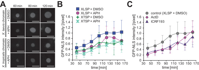 FIGURE 8:. Dynamics of nuclear import ability after modulating DNA content or chromatin condensation status. (A) Representative images of GFP-NLS proteins in the reconstructed nuclei for the four different conditions of DNA content after the indicated incubation time. Bars, 50 µm. (B) Dynamics of the mean GFP-NLS intensity per nuclear sectional area among four different conditions of DNA content (X. laevis sperm chromatin with DMSO [XLSP + DMSO, n = 11] and with aphidicolin [XLSP + APH, n = 6], X. tropicalis sperm chromatin with DMSO [XTSP + DMSO, n = 5] and with aphidicolin [XTSP + APH, n = 6]) and (C) samples with inducing chromosome condensation (ActD: n = 3: ICRF-193: n = 3; DMSO control: n = 11). The measured intensity value was divided by that of the control (XLSP + DMSO) condition after 120 min of incubation for each preparation. Average values from each extract preparation are connected by a line in each data set. Error bars, SD. |