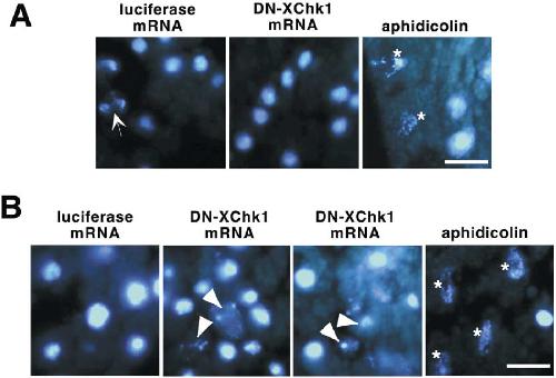 Fig. 2. DN-XChk1 induces chromatin condensation after the MBT. Embryos were injected with luciferase or DN-XChk1 mRNA or incubated in aphidicolin at