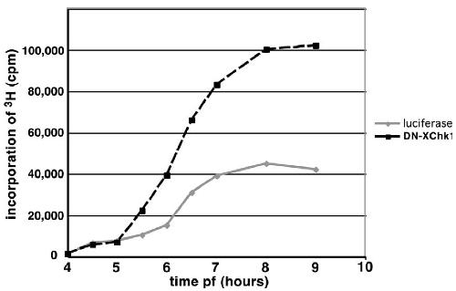 Fig. 5. Expression of DN-XChk1 results in elevated incorporation of [3H]thymidine after the MBT. Embryos were injected with luciferase or DN-XChk1