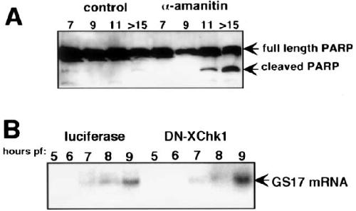Fig. 3. Inhibition of endogenous XChk1 results in apoptosis at the MBT. Embryos were injected with luciferase or DN-XChk1 mRNA at the one-cell stage. (A) Albino embryos were fixed and processed for TUNEL assays when morphology of embryos expressing DN-XChk1 appeared abnormal (approximately 12 hpf). A positive TUNEL is indicated by purple staining of nuclei. In a typical experiment 0-20% of luciferase-expressing embryos and 80-100% DN-XChk1-expressing embryos scored TUNEL-positive. (B) Embryos injected with luciferase or DN-XChk1 mRNA were assayed for caspase activity by the cleavage of the exogenous substrate, PARP. Times (h pf) are indicated.