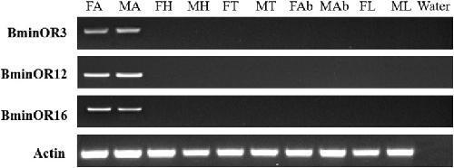FIGURE 3. Expression profiles of BminOR3, BminOR12, and BminOR16 in different tissues of male and female B. minax. FA, female antennae; MA, male antennae; FH, female heads (without antennae); MH, male heads (without antennae); FT, female thoraxes; MT, male thoraxes; FAb, female abdomens; MAb, male abdomens; FL, female legs; ML, male legs.