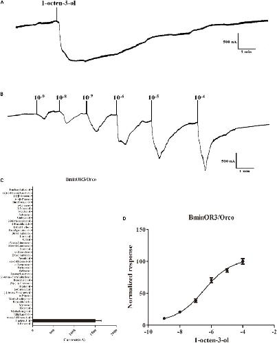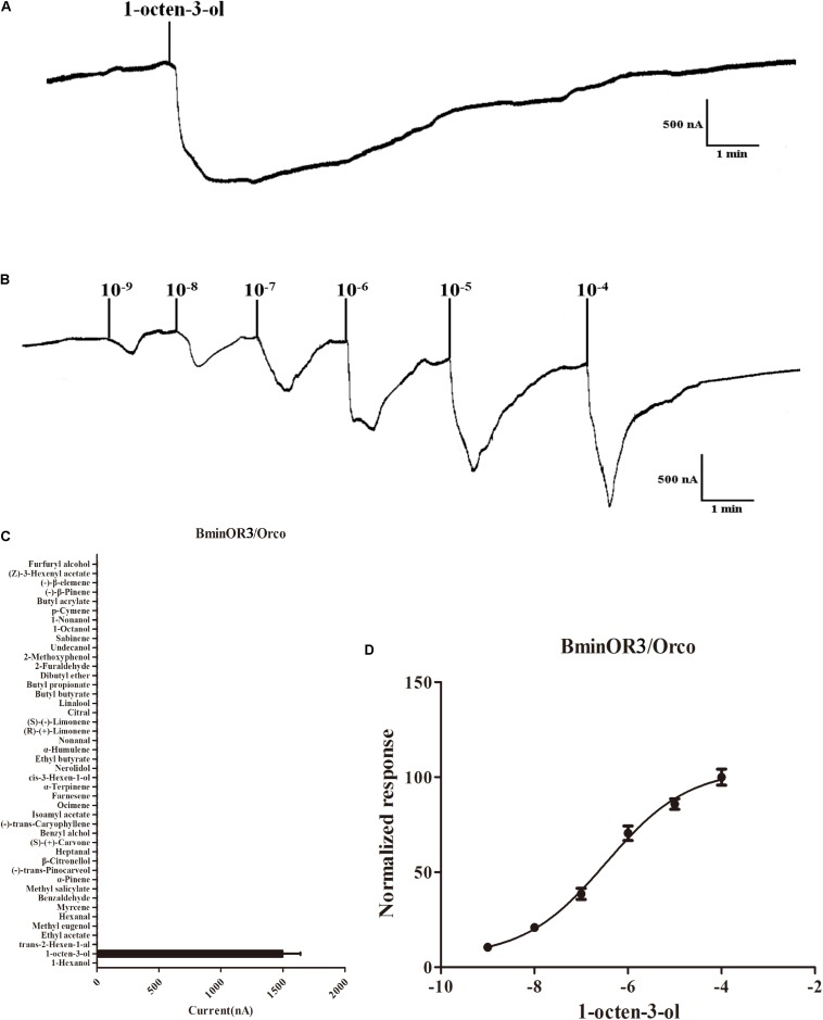 FIGURE 4. Responses of Xenopus oocytes with co-expressed BminOR3/BminOrco to stimulation with volatile compounds. (A) Inward current responses of BminOR3/BminOrco Xenopus oocytes in response to 10–4 M of the volatile compounds. (B) BminOR3/BminOrco Xenopus oocytes stimulated with a range of 1-octen-3-ol concentrations. (C) Response profile of BminOR3/BminOrco Xenopus oocytes. Error bars indicate SEM (n = 6) (T-test, P < 0.05). (D) Dose-response curve of BminOR3/BminOrco Xenopus oocytes to 1-octen-3-ol. 1-Octen-3-ol EC50 = 3.467 × 10–7 M. Error bars indicates SEM (n = 6).