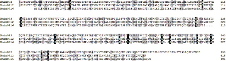 FIGURE 2. Alignment of the amino acid sequence of BminOR3, BminOR12, and BminOR16.