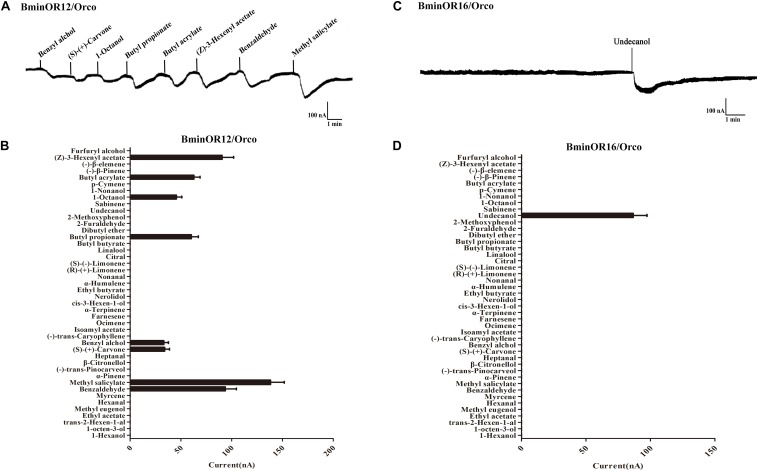 FIGURE 5. Responses of Xenopus oocytes with co-expressed BminOR12/BminOrco and BminOR16/BminOrco to stimulation with volatile compounds. Inward current responses of BminOR12/BminOrco (A) and BminOR16/BminOrco (C)