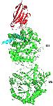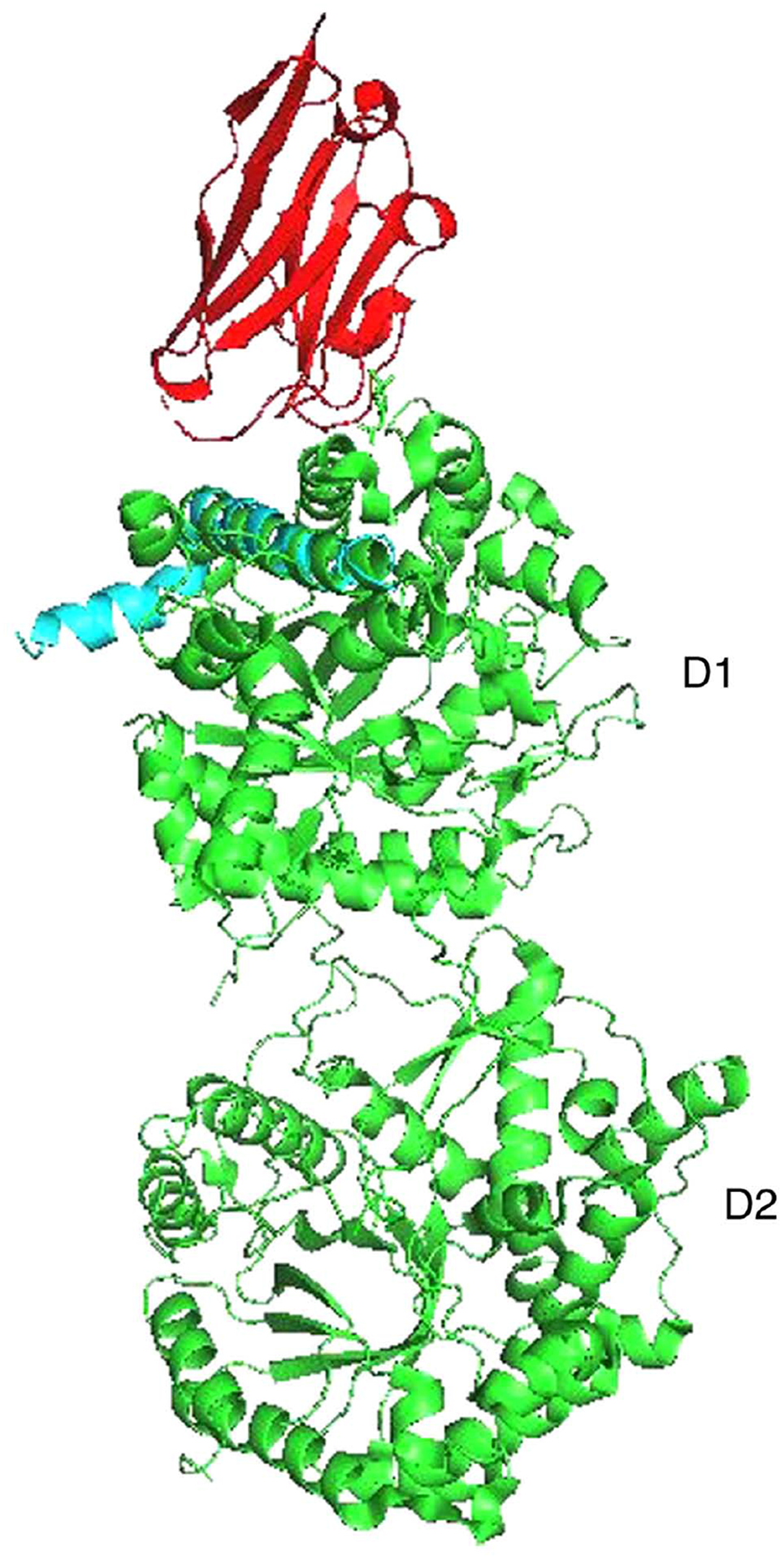 Figure 3. Alignment of klotho peptide (green) domain 1 (D1) with Aβ (blue). FGF21 (red) is bound to domain 1.
