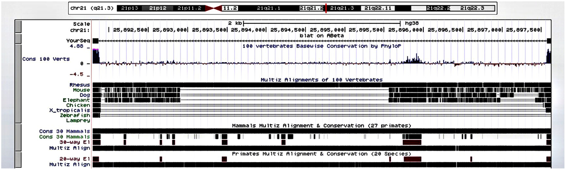 Figure 5. Alignment of 42 amino acid residue human Aβ across species in the UCSC genome browser. There is a high degree of alignment and conservation of Aβ (chr 21q21.3) in the rhesus monkey and 27 other primates, but much less alignment and conservation in the mouse, dog, and elephant, even less in the chicken, western clawed frog (Xenopus tropicalis), zebrafish and lamprey.