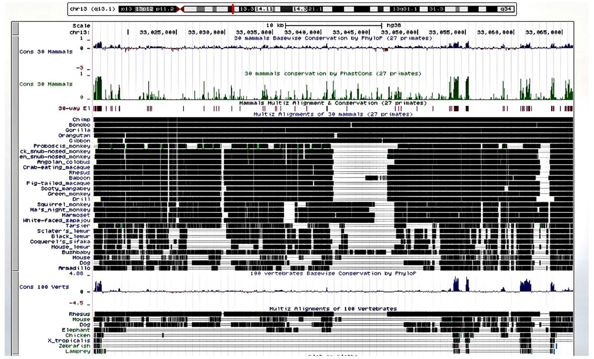 Figure 6. Alignment of human klotho across species in the UCSC genome browser. Results of the cross-species comparison of klotho show a high degree of alignment and conservation of human klotho (chr 13q13.1) in the chimp and 27 other primates, less alignment and conservation in the mouse, dog, and elephant, even less in the chicken, western clawed frog (Xenopus tropicalis), zebrafish and lamprey.