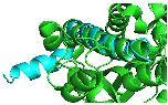 Figure 4. Closeup of alignment. Pymol performed 6 cycles of calculations on 165 aligned atoms, with a final root mean square deviation of atomic positions (RMSD) of 1.792 Å for 148 atoms. Amino acid residues phe76-val96 of klotho aligned closely with residues asp7-asn27 of Aβ.