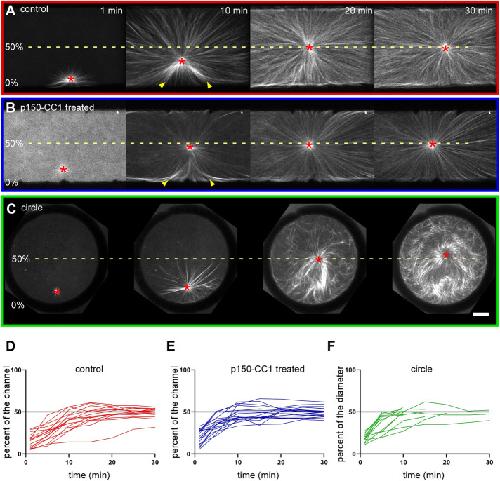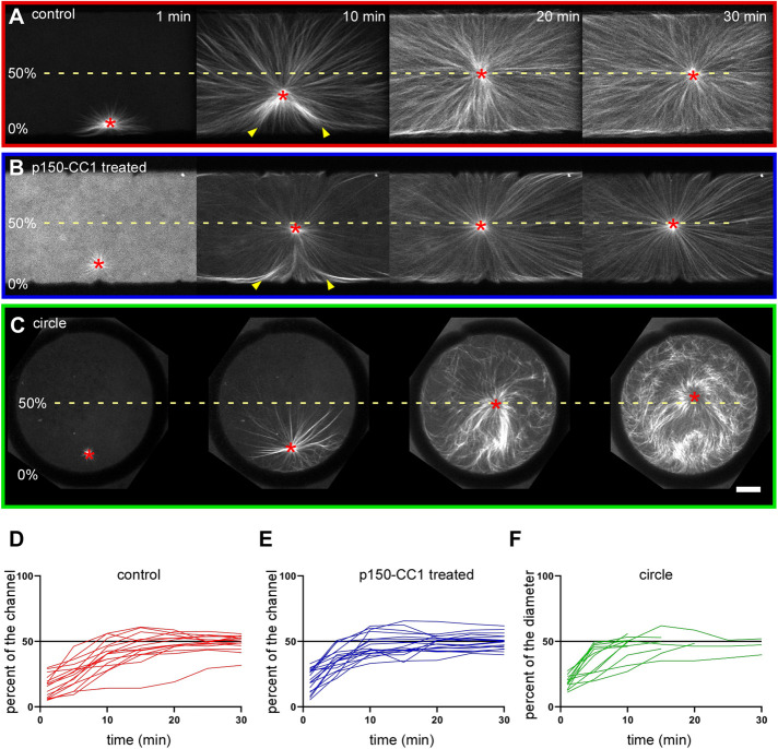 FIGURE 1:. Dynein inhibition via addition of p150-CC1 does not affect aster centration in X. laevis egg extracts. Centration of aMTOCs in interphase X. laevis egg extracts was investigated in PDMS microfluidic channels or hydrogel annular cylinders. Time-lapse spinning-disk confocal microscopy was used to visualize MTs, which were labeled with mCherry-TMBD and are shown in grayscale (AâC). The dashed line in each series of images runs through the midpoint of the channel width (A, B) or the center of the annular cylinder (C) and represents 50% of the channel width or interior diameter accordingly. Images in A show an aster starting near a PDMS channel wall (0%) and centering over time in untreated extract, whereas the images in B show similar aster centration in extract treated with 2 µM p150-CC1. Images in C show aster centration within a hydrogel annular cylinder in untreated extract. For each experimental condition, the aMTOC position (red asterisk) relative to the proximal wall was plotted over time as a percent of the channel width in D (red lines) and E (blue lines) and of the interior diameter in F (green lines). The colored lines represent traces from each individual experiment; n ⥠10 for each condition. Yellow arrowheads point to MT bending. For all images, scale bar = 20 µm. |