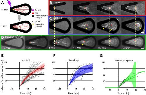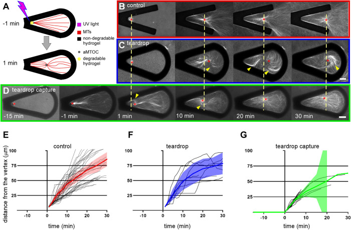 FIGURE 4:. Aster movement does not require bulk translocation of the entire MT network. The cartoon in A illustrates the approach used to decouple aster growth and aMTOC movement. aMTOCs were partially embedded in PEGdiPDA posts using the methodology described in Figure 3A such that they could nucleate MTs from their extract-exposed surfaces before being released. Time-lapse spinning-disk confocal microscopy was used to visualize MTs labeled with mCherry-TMBD as in Figure 1. The yellow dashed line at each time point in B extends from the aMTOC position (red asterisk) and is included to facilitate comparison of aMTOC velocities after release at time = 0. The images in B and C show aMTOC movement at the start of nucleation away from the vertex of a 30°V and a 30° teardrop, respectively. In contrast, the images in D show an aMTOC only partially embedded in the PEGdiPDA post and allowed to nucleate MTs for 15 min before light-induced release as described in A. For each experimental condition, aMTOC movement away from the barrier’s vertex was plotted as a function of time with positional data from B, C, and D shown in graphs E, F, and G, respectively. Shaded outlines represent 95% confidence intervals; gray lines represent each experiment; n ≥ 6. Yellow arrowheads point to MT bending. For all images, scale bars = 20 µm. |