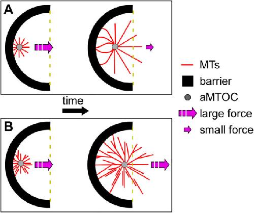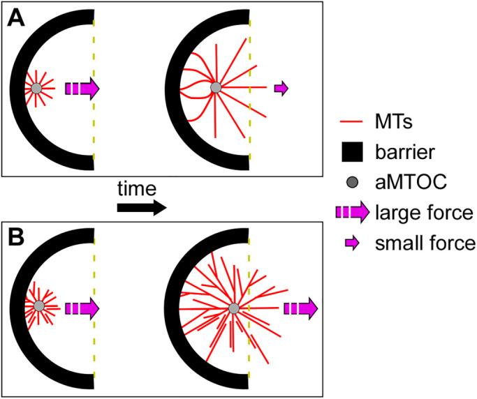FIGURE 5:. Cartoon summary for how MT-based pushing forces might facilitate aster movement in our system. The cartoon in A depicts how asters might behave assuming an unbranched, radial elongation model of aster growth. Initially, short unbundled MTs extending from the aMTOC and reaching the proximal barrier surface might be able to generate sufficient force to produce aster movement. However, later in time, once MTs approach their critical length, they would buckle under compressive loads, resulting in reduced force generation and a failure to center (dashed yellow line). The cartoon in B shows an architecturally more complicated aster with MT branching and bundling to effectively brace MTs and allow for more growing ends to impinge on the proximal barrier surface. In this model, MTs would be sufficiently buttressed by interactions with other MTs, resulting in a larger pushing force and, ultimately, a longer distance through which asters could traverse. |
