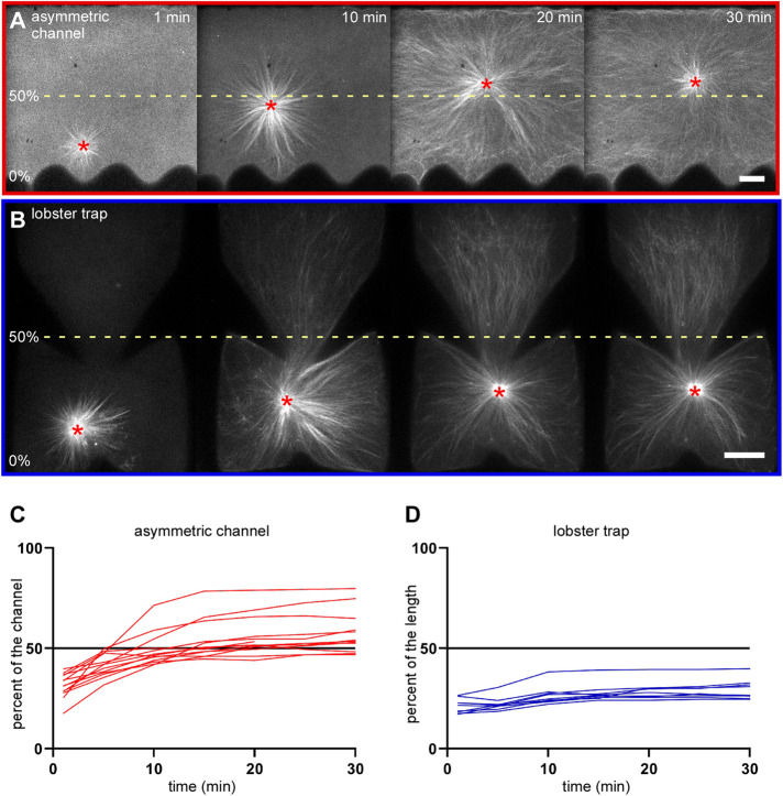 FIGURE 2:. Asters are unable to center when confined in certain asymmetric enclosure geometries. The ability of aMTOC asters to center was investigated in asymmetric microfluidic channels (A) and asymmetric hydrogel structures designed to resemble the cross-section of the inside of a lobster trap (B). Aster movement was visualized and tracked as described in Figure 1. For each set of time-lapse image series, the dashed yellow lines run through the midpoint of the asymmetric channel width (A) or the center of the lobster trap enclosure (B) and represent 50% of the channel width or interior length, respectively. For the experimental conditions shown in A and B, the aMTOC position (red asterisk) relative to the nearest wall at experimental onset was plotted over time as a percent of the channel width and interior length with the graphs in C (red lines) and D (blue lines), respectively. The colored lines represent individual traces for each experiment; n ≥ 9 for each condition. For all images, scale bars = 20 µm. |