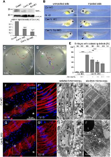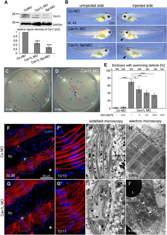 Figure 1. Loss-of-function of Cav1L affects sarcomeric organization and causes swimming defects. (A) Cav1L MO and Cav1L Spl-MO inhibit Xenopus Cav1L expression. Xenopus embryos were injected with 20 ng Morpholinos at the one-cell stage and Cav1α and GAPDH expression was analyzed by Western blotting at stage 27. The graph shows the relative Cav1α expression of four independent experiments, in relation to GAPDH expression and normalized to Co MO-injected embryos, data are meanâ±âs.e.m. ***p-valueââ¤â0.001 (Studentâs t-test). (B) Xenopus embryos were injected with 20 ng Morpholinos and mGFP RNA in one blastomere at the two-cell stage and analyzed at stage 42. Cav1L morphants show mild morphological abnormalities including a shortening of the anteriorâposterior axis, craniofacial malformations and edema formation (arrowhead). (C,D) Tracks of the swimming movement (time frame 4 s) of controls (C) and morphant embryos (D). (E) Percentage of swimming defects of embryos injected unilaterally with Morpholinos (5â7.5 ng) alone or in combination with res-cav1L RNA (+â=â100 pg;â+ââ+ââ=â200 pg,â+ââ+ââ+ââ=â300 pg), a Cav1L-construct lacking the Morpholino binding side, at the two-cell stage. Number of analyzed embryos is indicated for each column. Data from at least three experiments are presented as the meanâ±âs.e.m. * p-valueââ¤â0.05; **p-valueââ¤â0.01; ***p-valueââ¤â0.001 (Studentâs t-test). (F,G) Muscle morphology of stage 38 embryos, injected unilaterally with 20 ng MO at the two-cell stage; asterisks mark injected side. Phalloidin staining reveals sarcomeric actin; DAPI staining marks the nuclei. (Fâ,Gâ) Higher magnification of the boxed areas in (F,G). Controls show normal sarcomeric actin organization, while morphants display wavy and disorganized actin fibers. (H,I) Single somitic segment of a control embryo (H) or a Cav1L morphant (I), injected with 10 ng MO in both blastomeres at the two-cell stage, showing disrupted actin organization within muscle cells. (Hâ,Iâ) Transmission electron microscopy (TEM) picture of control muscle cells with normal sarcomeric organization (Hâ) and Cav1L-morphant muscle cells, which do not show the characteristic sarcomeric structure. Arrowhead marks detached actin bundles; L lipid droplet, Nc notochord. |