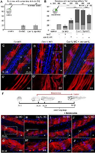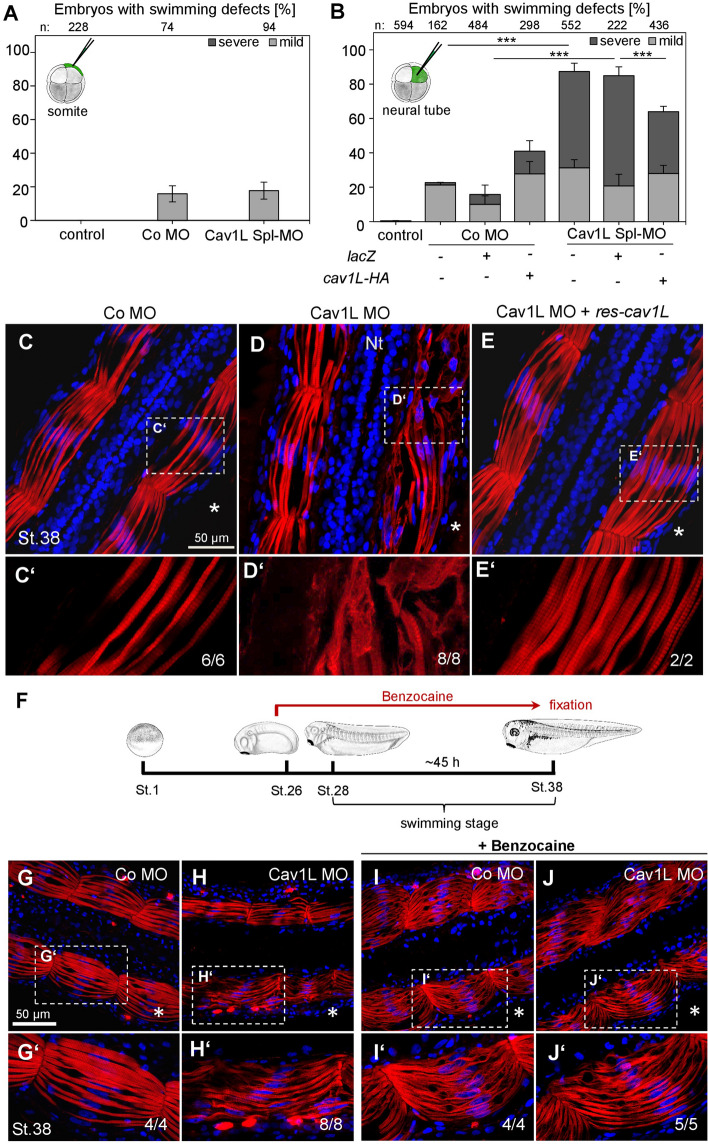 Figure 4. Loss-of-function of Cav1L in neural tissue or Benzocaine-treatment causes muscular disorganization and swimming defects. (A,B) 10 ng MO alone or in combination with 100 pg cav1L-HA RNA were targeted to the somites (A) or the neural tube (B) at the 8-cell stage and the percentage of swimming defects (three independent experiments) were analyzed at stage 38. LacZ RNA injection was used to control for RNA toxicity or unspecific rescue effects. Data from at least three experiments are presented as the meanâ±âs.e.m.. ***p-valueââ¤â0.001 (one-way ANOVA comparing the total number of swimming defects). (CâE) Muscle morphology of neural-injected embryos were analyzed by sectioning and Phalloidin staining. Asterisks indicate the injected side. (C) Normal actin organization in a control embryo. (D) Highly disrupted actin organization on the injected side of Cav1-morphant embryo. (E) Co-expression of res-cav1L RNA in neural tissue restores actin organization of Cav1L-morphant muscle cells. (Câ,Dâ,Eâ) Higher magnification of the boxed areas shown in (CâE). (F) Embryos were injected unilaterally with 20 ng MO and cultivated until stage 26 when Benzocaine was added to the medium. Embryos were fixed at stage 38, sectioned longitudinally and stained with Phalloidin. Asterisks in (GâJ) indicate the injected side. (G) Normal muscle morphology of a control embryo. (H) Loss-of-function of Cav1L disrupts somitic actin fiber organization. (I,J) Benzocaine-treated embryos. The absence of neural activity caused by Benzocaine-treatment results in disorganized actin fibers in controls (I) as well as Cav1L-morphant embryos (J). (Gâ,Hâ,Iâ,Jâ) Higher magnification of the boxed areas shown in (GâJ). |