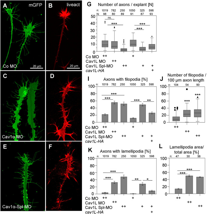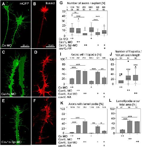 Figure 6. Cav1L knockdown affects axonal growth and morphology in vitro. (AâN) Loss-of-function of Cav1L increases filopodia as well as lamellipodia formation in cultured spinal cord neurons, isolated from embryos that were injected with either 12 ng (++) or 10 ng (+) Morpholino in both blastomeres at the two-cell stage. Actin staining is shown in (D) (Co MO), (E) (Cav1L MO) and (F) (Cav1L Spl-MO). (A,B) Control axons show typical actin-positive growth cones. (CâF) Filopodia- and lamellipodia-like actin-positive structures in Cav1L-morphant neurons. (G) Box plot showing the number of axons (n) per explant (N) (Tukey Box plot with whiskers with maximum 1.5 IQR (MannâWhitney test)). Co-expression of 10 pg Cav1L Spl-MO in combination with 200 pg cav1L-HA RNA significantly improved axonal outgrowth. (I) Percentage of axons with increased filopodia-like structures. Co-expression of 200 pg cav1L-HA RNA significantly decreased the number of axons with filopodia. (J) Number of filopodia per 100 µm axon length. (K) Percentage of axons with lamellipodia. Co-expression of 200 pg cav1L-HA significantly decreased the number of axons with lamellipodia. (L) Percentage of lamellipodia area in relation to total axon area. Data in (I,K,L) are meanâ±âs.e.m. from at least three experiments (Studentâs t-test). Number of analyzed axons (n) are indicated for each column. * p-valueââ¤â0.05; **p-valueââ¤â0.01; ***p-valueââ¤â0.001. |