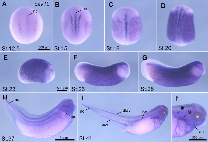 Figure 2. Cav1L is expressed in the notochord and the cardio-vasculature during Xenopus development Temporal and spatial cav1L expression analyzed by in situ hybridization. (A) Dorsal view of a stage 12.5 embryo, cav1L is detected in the notochord and two thin stripes on both sides at the dorsal midline. (B) Dorsal view of an embryo at stage 15. Cav1L expression is visible in the notochord and in a punctuated pattern in the skin. (C) Stage 18 embryo showing the same expression pattern as described in B. Cav1L is strongly expressed in the epidermis of a stage 20 embryo (D), stage 23 embryo (E), stage 26 embryo (F) and stage 28 embryo (G). (H) Cav1 expression is visible in the notochord, epidermis and aortic arches of a stage 37 embryo. (I) Cav1 is expressed in the notochord and the cardio-vasculature of the tail (dlav, pcv, isv) of a stage 41 embryo. (Iâ) Magnification of the embryo shown in I. Cav1 is expressed in the lung, lymph heart and aortic arches. Aa aortic arches, Dlav dorsal longitudinal anastomosis vessel, Isv/Isa intersomitic vessels/artery, lh lymph heart, lg l ung, nc notochord, Pcv posterior cardinal vein. |