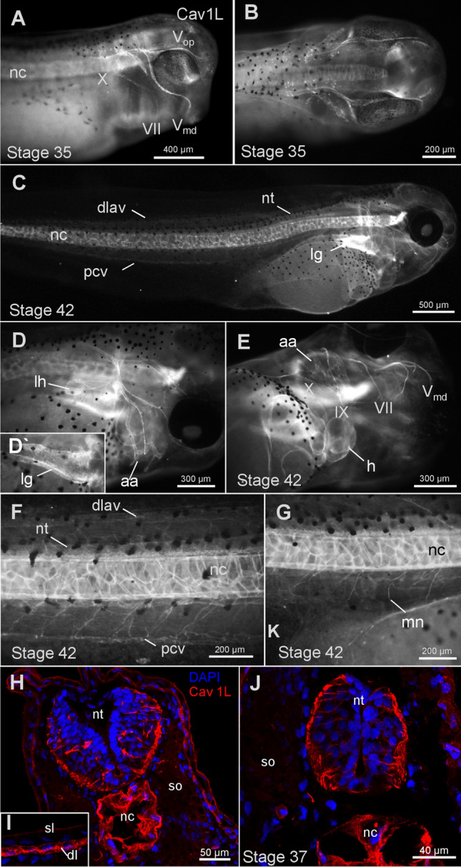 Figure 3. Cav1 is expressed in the nervous system during Xenopus development. (A) Immunostaining of a stage 35 embryo showing Cav1 protein expression in the notochord and the cranial nerves. (B) Dorsal view of a stage 35 embryos. Cav1 expression is visible in the cell bodies of the cranial nerve located in the brain. (C) Stage 42 embryo. (D) Higher magnification of a stage 42 embryo. Cav1 is expressed in the cranial nerves, aortic arches and the lymph heart. (Dâ) Image focusing on the Cav1 expression in the lung of the embryo shown in (F). (E) Ventral view of the embryo shown in (D). Cav1 staining is visible in the heart, aortic arches and cranial nerves. (F) Tail of a stage 42 embryos showing Cav1 expression in the cardio vasculature and neural tube. (G) Tail of a stage 42 embryo showing Cav1 expression in the notochord and motor neurons (H) Transverse section of the hindbrain of a stage 37 embryo showing Cav1 expression in red and DAPI staining in blue. Cav1 is expressed in neurons and the notochord. (I) Magnification of the epidermis of a stage 37 embryo. Cav1 is expressed in the deep layer of the epidermis. (J) Transverse section of the neural tube of a stage 37 embryo showing Cav1 expression in the neural tube and notochord. Aa aortic arches, Dlav dorsal longitudinal anastomosis vessel, ep epidermis, h heart, il inner layer of the epidermis, Isv/Isa intersomitic vessels/artery, lh lymph heart, lg lung, mn motor neurons, nc notochord, nt neural tube, Pcv posterior cardinal vain, so somites, sl sensory layer of the epidermis, VII facial nerve, Vop ophthalmic trigeminal ganglion, Vmd mandibular trigeminal ganglion, IX glossopharyngeal nerve, X vagus nerve. |
