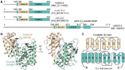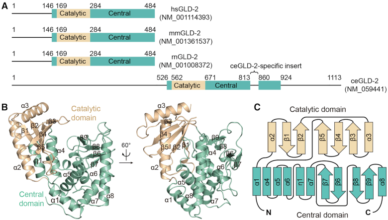 Figure 1. Overall structure of GLD-2. (A) Schematic representation showing the domain organization of mammalian and Caenorhabditiselegans GLD-2 homologs. Borders of the domains are indicated by residue numbers. hs, Homo sapiens; mm, Mus musculus; rn, Rattus norvegicus; ce, Caenorhabditis elegans. (B) Cartoon representation of rnGLD-2, colored as in A. The identity of each helix and β-strand are indicated. (C) The topology diagram of rnGLD-2. Secondary structural elements are not drawn to scale. Elements of rnGLD-2 are named and colored as in B.