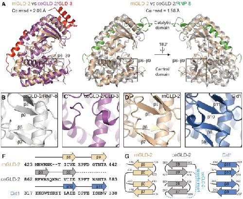 Figure 2. Structure comparison between rnGLD-2 and ceGLD-2. (A) Structural superposition of rnGLD-2 with ceGLD-2 complexed with GLD-3 (left, PDB code: 4zrl) or with RNP-8 (right, PDB code: 5jnb). The β6−β9 regions are indicated. (B andC) Structural details of ceGLD-2 at the tip of the central domain when complexed with RNP-8 (B) or with GLD-3 (C). (D andE) The β-sheet at the central domain of rnGLD-2 (D) and Cid1 (E). (F) Sequence alignment for β8−β9 of GLD-2s from various species and corresponding β10−β11 of Cid1. Residues after β9 of ceGLD-2 that are missing in the structural model are indicated by a dashed line. (G) Comparison of the β-sheet at the central domain for rnGLD-2, ceGLD-2 and Cid1 shown as topology diagrams. The ceGLD-2 specific insert is indicated as a blue dashed line. Note the difference in the arrangement of β8 and β9 between rnGLD-2 and ceGLD-2.